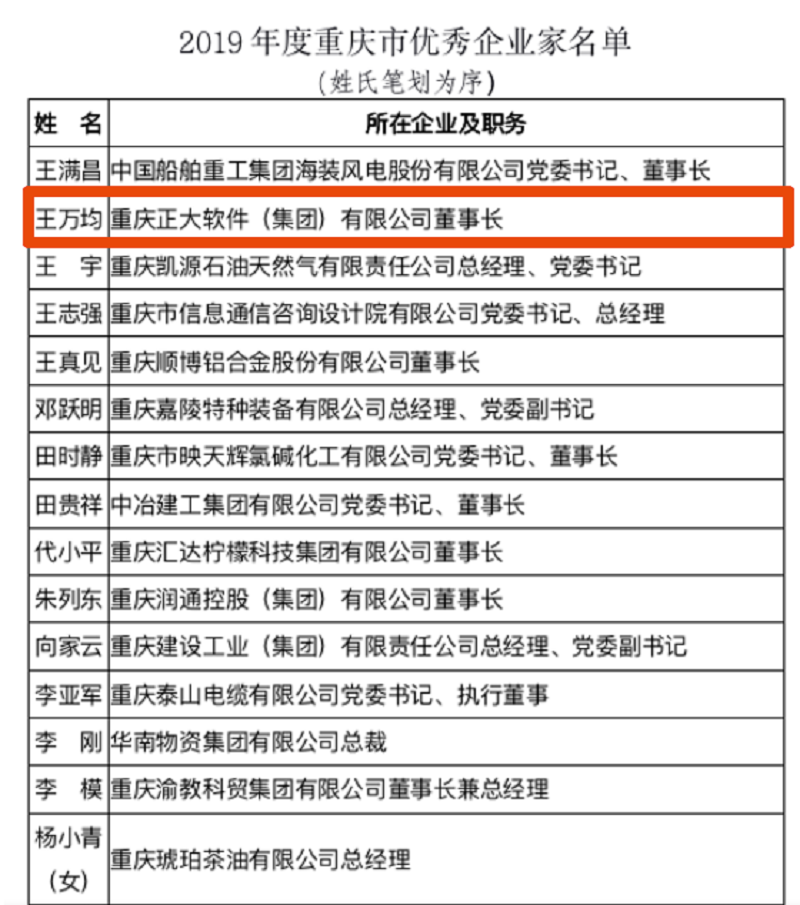 本网讯 12月30日下午,重庆市企业联合会(企业家协会)举行了2019年度重庆市优秀企业家表彰大会,重庆正大软件(集团)有限公司董事长、重庆工程学院董事长王万均等40位企业家被授予“2019年度重庆市优秀企业家”荣誉称号,重庆日报、中国网、华龙网、上游新闻、搜狐、新浪、东方财富网等多家主流媒体先后作了专题报道。