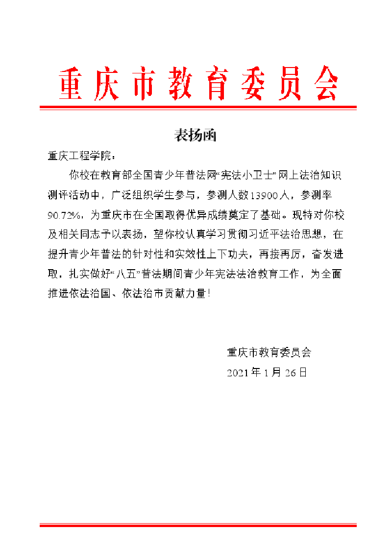 本网讯(文/大学生记者团 汪聂军 图/党委宣传部)1月26日,我校收到了重庆市教育委员会寄来的表扬函,以表彰学校在2020年组织开展青少年普法学习工作取得的突出成绩。自2020年12月15日起,我校按照市教委下发的通知要求,积极组织全体在校学生完成教育部全国青少年普法网“宪法小卫士”网上法治知识测评,进一步推进我校的学生宪法学习宣传教育,增进大学生宪法法治意识。