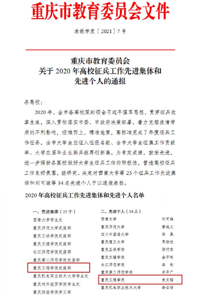 本网讯(文/图 党委武装部 朱文韬)3月10日,重庆市教委召开2021年全市大学生征兵工作推进会,会上宣读了《重庆市教育委员会关于2020年高校征兵工作先进集体和先进个人的通报》(渝教学发〔2021〕7号),我校党委武装部被评为“2020年高校征兵工作先进集体”荣誉称号,我校朱文韬同志被评为2020年高校征兵工作先进个人。