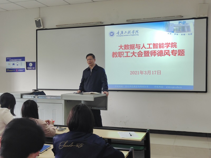 本网讯(文/图 大数据学院 唐蕾)为深入学习贯彻习近平关于高等教育要看得远、谋得深、点得准、想得细的指示精神,引导教师严格遵守师德规范、弘扬高尚师德,不忘从教初心、潜心教书育人,根据学校颁布的《关于加强师德师风建设的实施意见(修订)》(渝工程委〔 2020 〕49 号),3月17日下午,大数据与人工智能学院先后组织召开全院教职工大会暨师德师风专题培训会和学生代表座谈会。