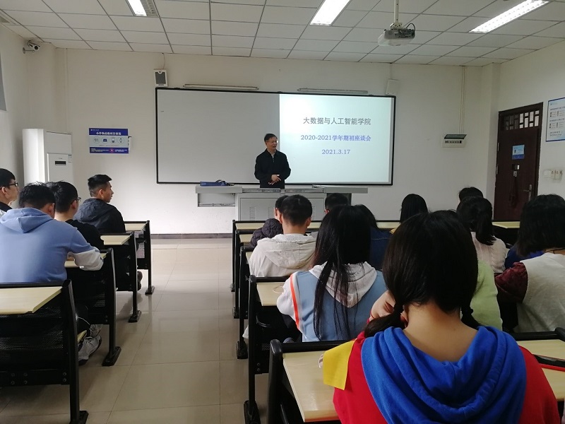 之后,大数据学院召开了2018、2019级期初学生代表座谈会,院长曹耀钦、党支部副书记尚伟、副院长陈欣、杨倩及与会班级班导师、辅导员和学生代表参加。