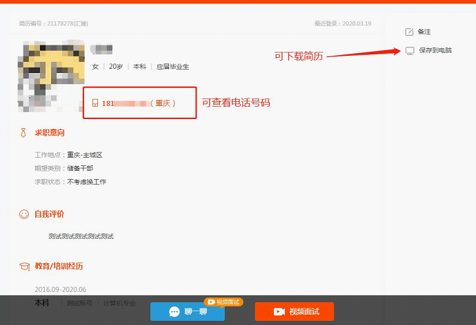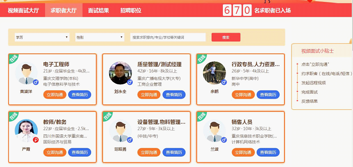 3、若没有求职者申请视频面试,HR可在求职者大厅搜索符合岗位要求的简历进行沟通(求职者大厅下载的简历需学生回复后方可进行视频面试,且必须把主动申请的学生面试完成后才能在求职者大厅搜索简历进行沟通)。