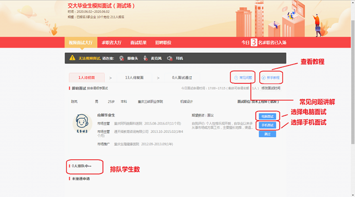 2、活动当天,学生申请视频面试后,企业HR请根据顺序依次进行视频面试。当点击视频面试后,视频未接通,该学生将自动转至排队最后位,需将正常排队的学生面试后,再对该学生进行视频邀约。