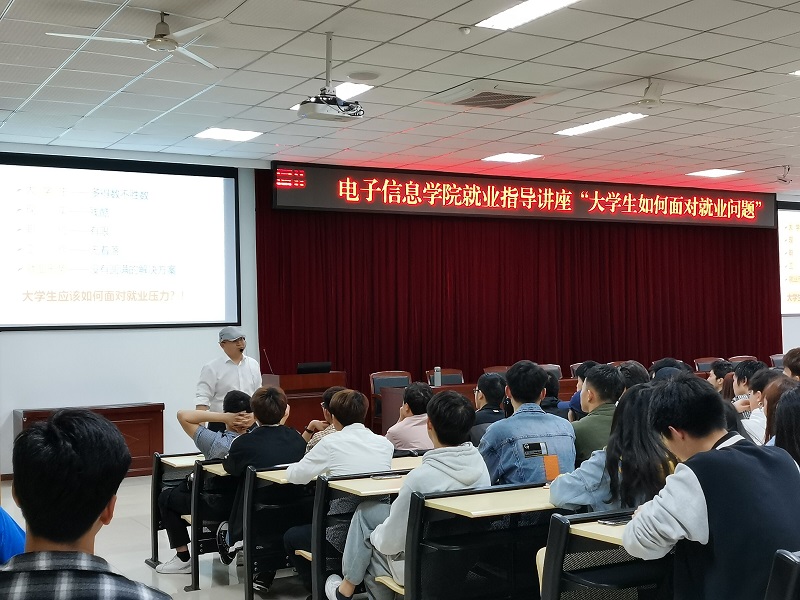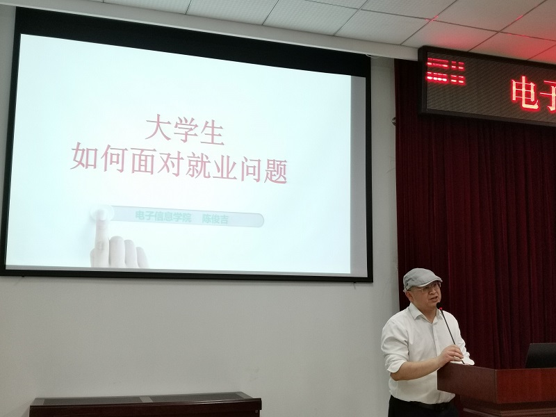 本网讯(文/图 电子信息学院 黄炼旗)为进一步提升大三学生的职业道德素养和就业能力,3月30日晚,电子信息学院举办了一场名为“大学生如何面对就业问题”的就业指导讲座,电子信息学院陈俊吉博士应邀担任主讲,2018级全体同学参加。