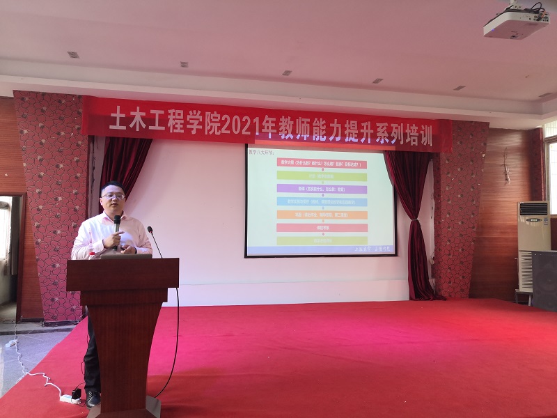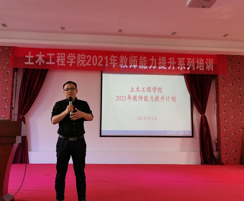 本网讯(文/图 土木工程学院 毛云莹)3月31日,土木工程学院开展了2021年教师能力提升(内部培训)计划第二次培训,副院长汪金能带领全体教职工学习了教学大纲等教学文件的编制规范。