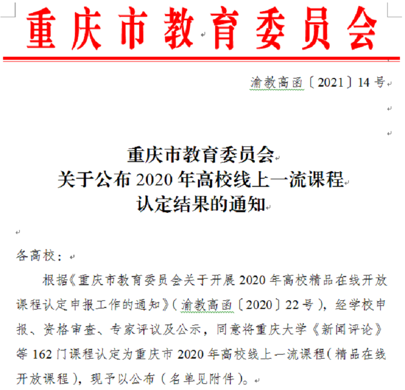 据了解,重庆市教委于2017年启动首批重庆市高校精品在线开放课程认定工作,我校连续3年在重庆市高校精品在线开放课程认定工作中取得好成绩。截至目前,我校共有7门课程被认定为重庆市精品在线开放课程。