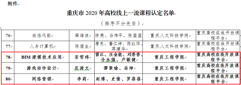 本网讯(文/图 教务处 魏玉琛)近日,重庆市教育委员会正式公布了2020年高校线上一流课程(精品在线开放课程)认定结果。我校数字艺术学院教师庄涛文负责的《游戏动作设计》、土木工程学院教师安雪玮负责的《BIM建模技术应用》和管理学院教师李莉负责的《网络营销》3门课程入选。