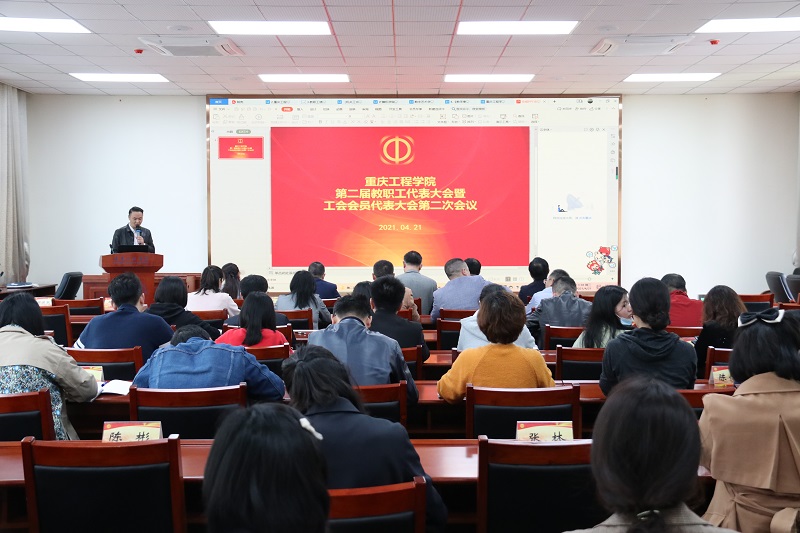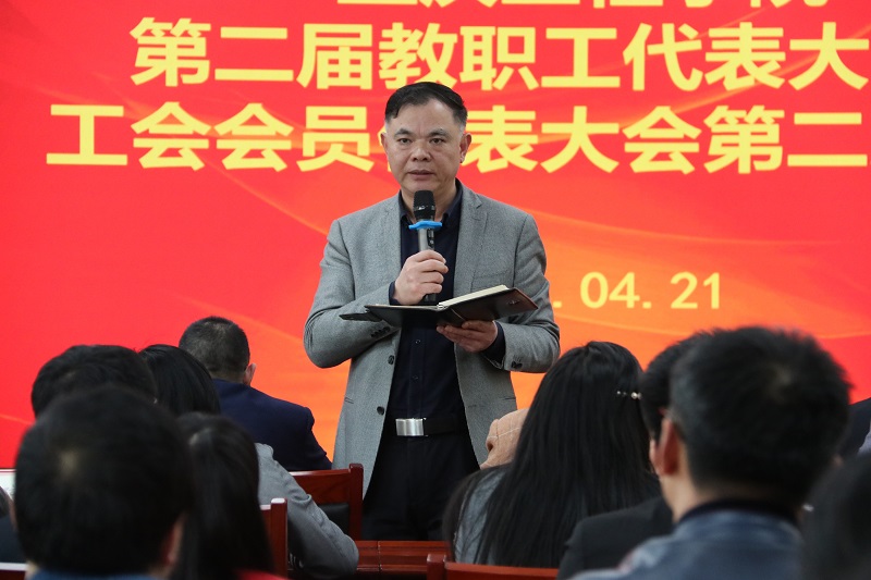 本网讯(文/校工会 邓俊梅 图/大学生记者团 袁艺谋)4月21日下午,我校在第四会议室召开了第二届教职工代表大会暨工会会员代表大会第二次全体会议,审议通过了《学校职称评审(推荐)管理办法(修订)》等4个文件制度。校长桂国庆,党委书记兼督导专员谭明术,党委副书记兼常务副校长张业平,副校长王琼花,纪委书记兼工会主席唐小勇作为教代会代表出席会议。会议由工会副主席熊力主持。