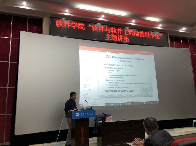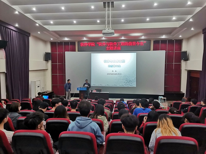本网讯(文/图 软件学院 李阳)4月21日下午,软件学院举办了软件工程专业知识学习讲座。本次讲座邀请到了重庆邮电大学软件工程学院院长、重庆市第五届政协常委钱鹰教授担任主讲。软件学院院长王越、副院长李华平、副院长汪俊良以及软件工程专业的150余名学生到场参加。