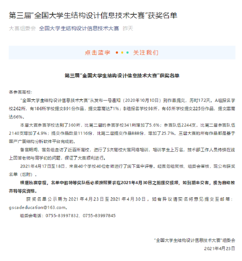 本网讯(文/图 土木工程学院 高丽)4月23日,全国大学生结构设计信息技术大赛组委会正式公布了第三届全国大学生结构设计信息技术大赛获奖名单,我校土木工程学院选送的三支参赛队伍获B组特等奖一项和三等奖两项。