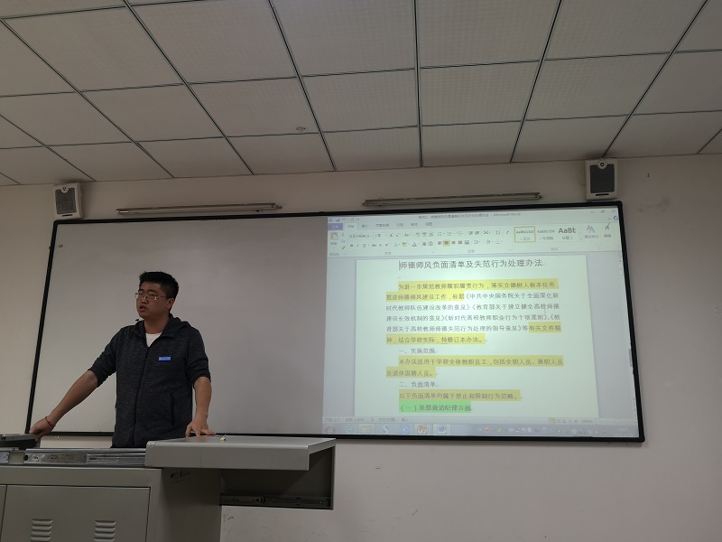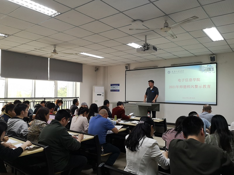 最后,谭思宇要求电子信息学院全体教师要牢记立德树人的使命,履行教书育人的责任,要用习近平新时代中国特色社会主义思想武装头脑,自觉做到从严修身、从严律己,严守师德师风红线,用实际行动来诠释“学为人师、行为世范”的职业精神。