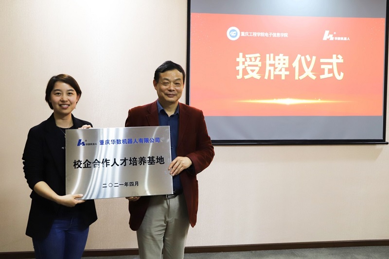 授牌仪式上,王旭丽首先致欢迎辞,她指出,华数机器人的快速发展需要强有力的人才支撑,希望校企之间加强合作,深化协同育人,共同培养符合行业发展的高级紧缺人才。何世彪重点介绍了重庆工程学院的办学模式和特色,包括学院在电子信息、自动化类专业人才培养方面所取得的优异成绩,何院长强调,双方拥有良好合作基础与发展前景,希望在接下来的合作当中取得新的成果。此外,何院长现场为企业授予了“校外实践教学基地”牌匾,并接受了企业授予的“校企合作人才培养基地”牌匾,双方就后续学生入驻实习及管理等工作进行了安排部署。