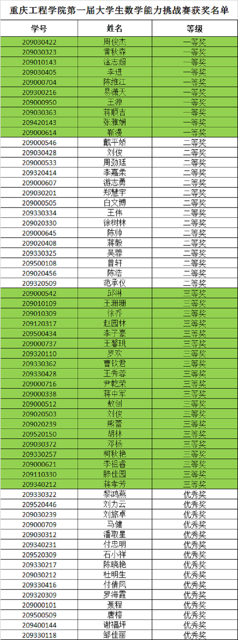 本网讯(文/图 通识学院 杨佳丽)5月27日,由通识学院数学教学部承办、“数说”川渝高校虚拟数学教研室协办的重庆工程学院第一届大学生数学能力挑战赛决赛结果正式公布,共有60人获得名次,其中一等奖10名,二等奖15名,三等奖20名,优秀奖15名。本次比赛是我校举办的第一届大学生数学能力挑战赛,由通识学院数学教学部承办、“数说”川渝高校虚拟数学教研室协办,挑战赛分别在5月14日、5月21日举办了线上初赛和线下决赛。