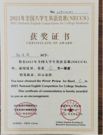 本网讯(文/图 通识学院 杨佳丽)5月16日,2021年全国大学生英语竞赛在重庆大学举办,我校8名参赛选手从初赛1271人中脱颖而出入围决赛。近日,组委会公布获奖名单,我校2018级学生敬涵洋、周逸飞、张博,2019级学生尤娜、陈春荣、刘柳,2020级学生郑笑笑获得C类一等奖;2019级张昕睿获得了D类一等奖,另外我院外语教学部获得了组委会颁发的“优秀组织奖”。本次比赛由通识学院外语教学部尹宝莲、王晓晓老师带队参加,并对参赛选手进行多轮次的赛前辅导和选拔,为决赛稳定发挥提供了强有力的保障。