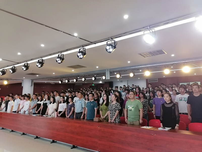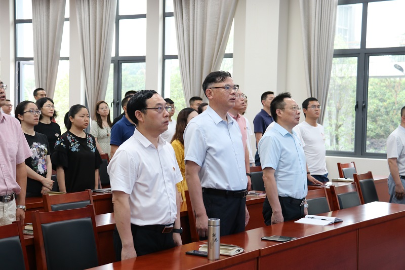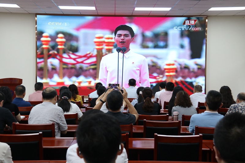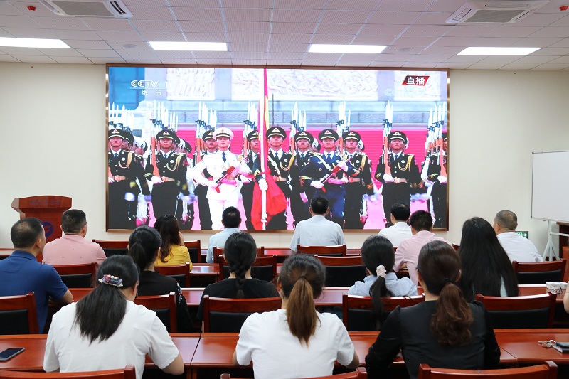 上午八点,在南泉校区办公楼的第四会议室内,全体校领导、职能部门员工、学生代表共计100余人集中观看网络直播。伴随着庄严肃穆的国歌声,现场人员全体起立,向着大屏幕里升起的五星红旗行注目礼。