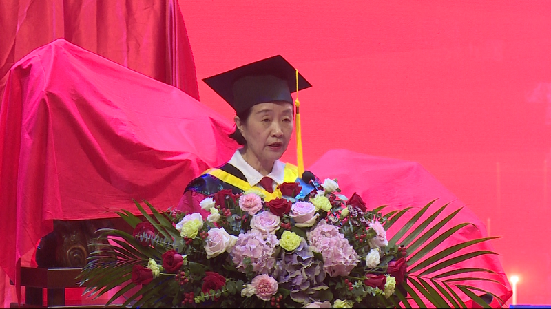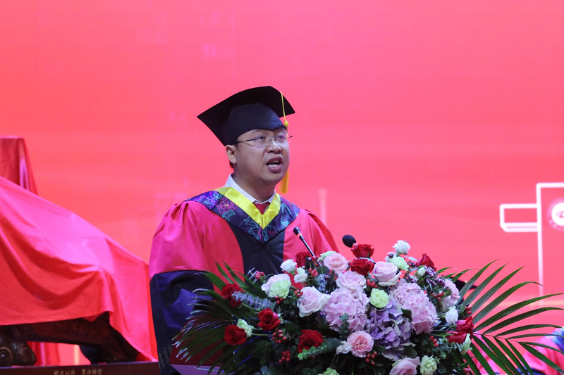 教师代表、大数据与人工智能学院教师廖宁上台发言,廖老师祝愿各位毕业生前程似锦、一帆风顺,希望大家今后用行动展示出学校的人才培养实力,也希望同学们留出一点时间思考如何提升核心竞争力和不可替代性。