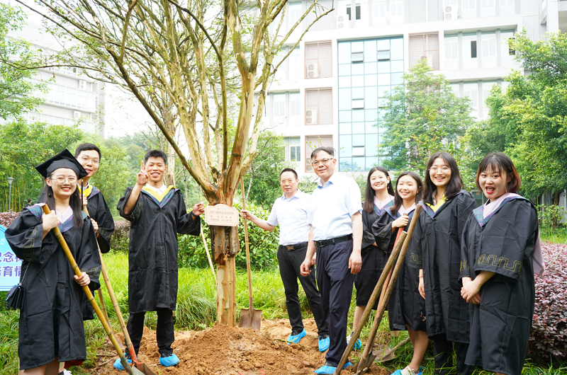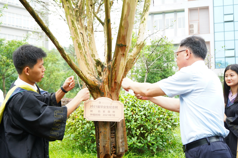 最后,毕业典礼在全体老师与毕业生们起身齐唱《香樟情怀》的歌声中落下帷幕。典礼结束后,学校领导、导师代表和毕业生代表们分别来到校前广场合影,同时还在第六教学楼附近的绿化带里一起种下了2021届毕业生纪念树。