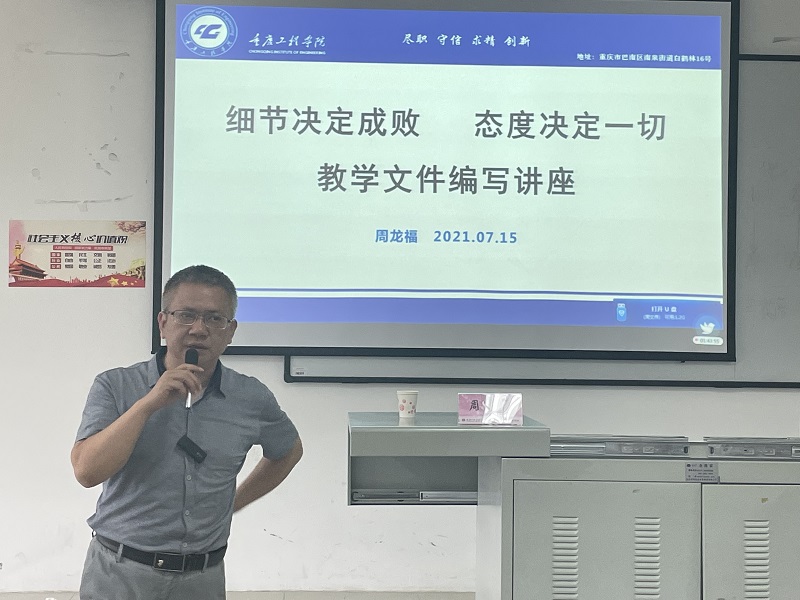随后,周龙福助理以《细节决定成败,态度决定一切———教学文件编写》为题目,紧扣说课和讲课定义、教学大纲编写、教案编写、试卷统计分析表编写等方面进行了剖释。首先周助理从目的、对象和内容等方面阐述了说课和讲课的区别,强调了要说好一门课要注重教学全程的总体设计思路,而要说好一堂课要注意重点与难点的处理,以及教学板书的设计;其次详细讲解了学校教学大纲模板和教案的规范化编写标准,并通过实际案例指出编制过程中出现的常见问题,针对每一个细节提出对应改进方向;最后对试卷统计分析表的编写提出要求和建议。