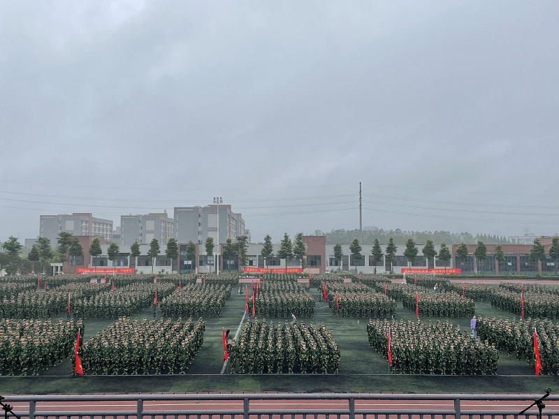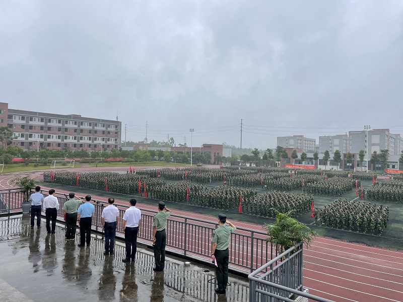 军训动员大会进行时天空下起了瓢泼大雨,新绿的军装和接连不断的大雨在双桥校区足球场相映成辉。在大雨中,参加军训动员大会的全体人员按标准军姿站立、岿然不动。伴随雄壮的国歌声响起,军训开训仪式正式拉开帷幕,也标志着2021级新生的军训生涯正式开始。