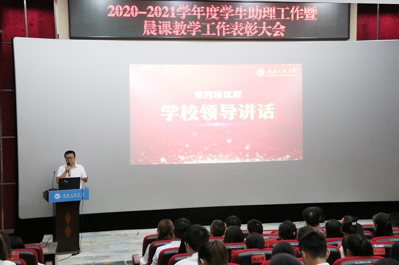 会上学工部部长黄燕、素质教育中心副主任邹春霞分别宣读了《关于表彰2020-2021学年度优秀学生助理、学生助理团队、指导教师和组织单位的决定》《关于表彰2020-2021学年度重工演讲之星、优秀晨课助教、优秀指导教师和晨课组织先进班级的决定》,并对所有的获奖同学、老师、组织单位表示祝贺。