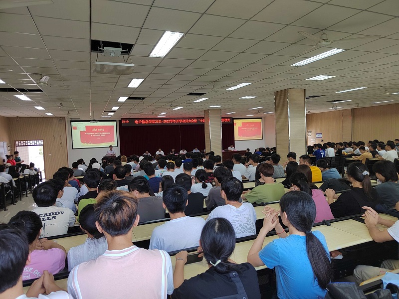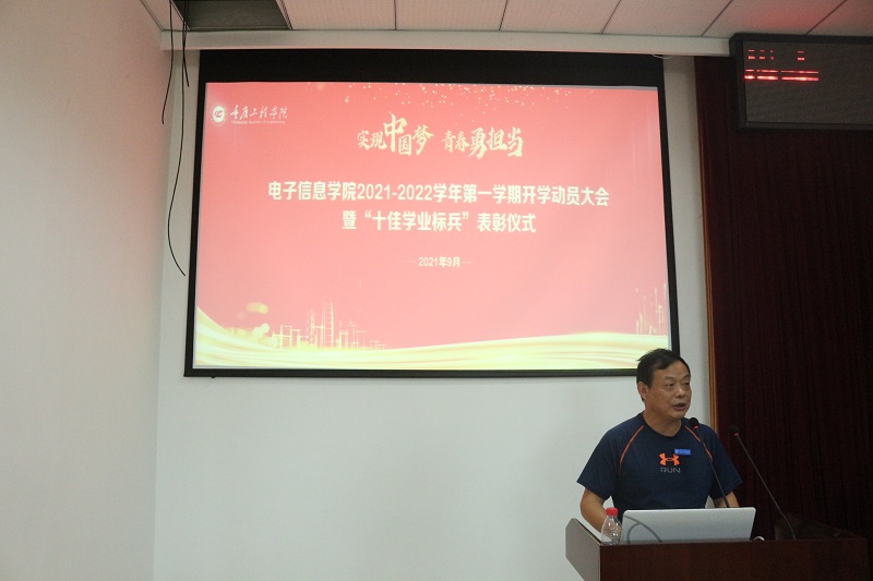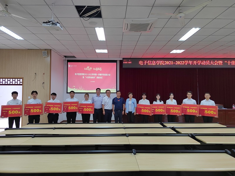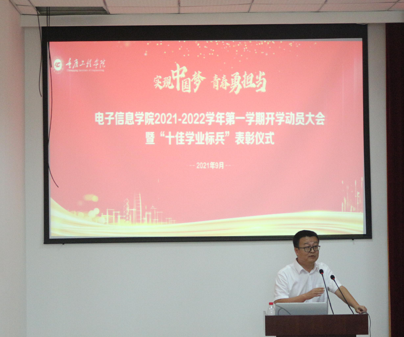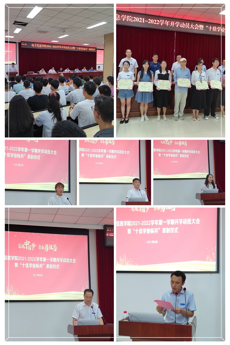 本网讯(文/图 电子信息学院 涂敦兰)为迎接新学年、新学期的到来,营造浓厚的开学氛围,增强师生的责任感和使命感,明确新学期的奋斗目标,电子信息学院于9月15日在6302教室召开以“实现中国梦、青春勇担当”为主题的2021-2022学年开学动员大会暨“十佳学业标兵”表彰仪式。校长助理王建东、学工部部长黄燕,学院全体领导、老师以及各班级学生代表共计400余人参加会议,本次会议由学院党总支书记谭思宇主持。