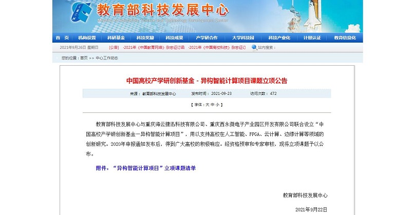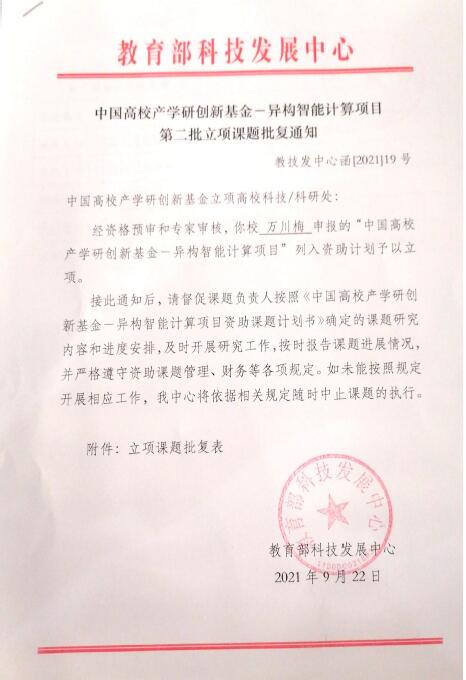 “中国高校产学研创新基金—异构智能计算项目”由教育部科技发展中心与重庆海云捷迅科技有限公司、重庆西永微电子产业园区开发有限公司联合设立,用以支持高校在人工智能、FPGA、云计算、边缘计算等领域的创新研究。该项目的成功立项,对我校在教育部产学研项目申报立项,高校知识产权运用,科技成果转移转化和科技成果奖励申报等方面打下坚实基础。