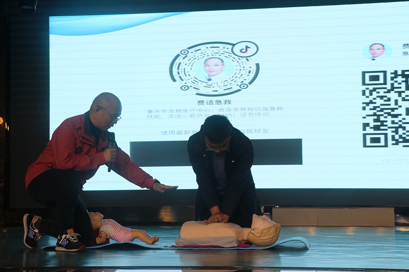 重庆市急诊医学培训中心费夕丰生动有趣的给现场师生进行了各种细致入微的应急技能培训,包括心肺复苏、呼吸道异物梗阻、AED的使用、创伤急救等。“心肺复苏的正确打开方式是什么”“婴儿、青少年喉咙有异物分别怎么处理”“AED如何规范使用”等急救问题,培训后全都迎刃而解。