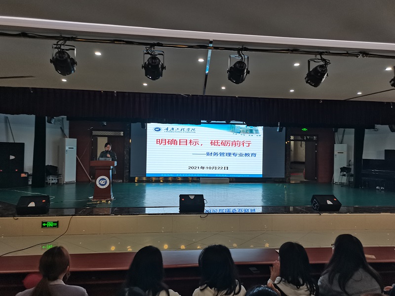 本网讯(文/图 管理学院 史玉琳)10月22日下午,管理学院刘达斌书记,工商管理系主任周小波老师、副主任郭英老师,电子商务系主任宋超老师,会计系副主任史玉琳老师一行5人前往重庆工程学院双桥校区,面向2021级工商管理类和电子商务类新生进行了专业认知教育。
