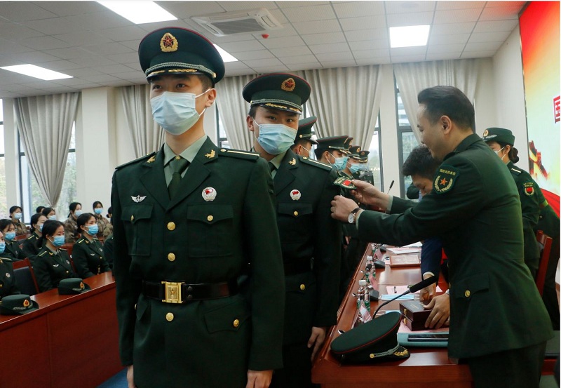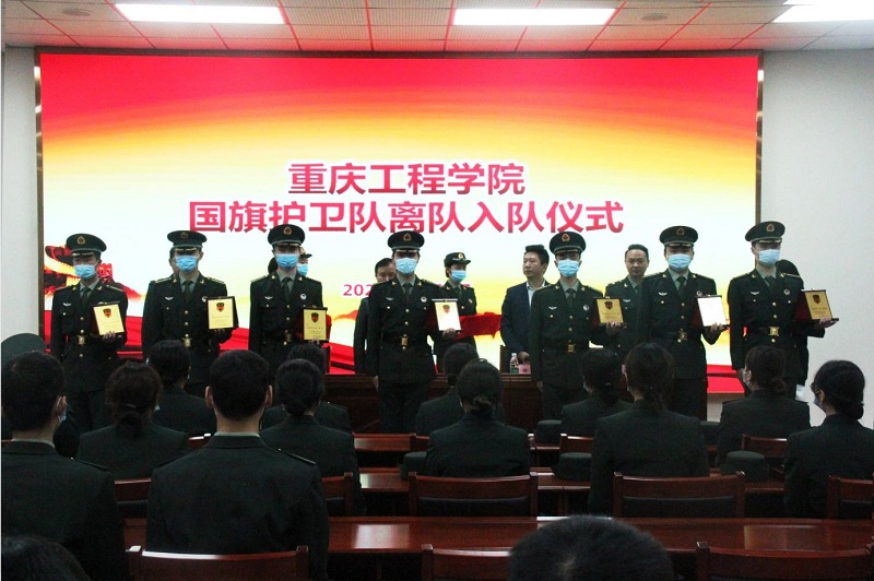 紧接着举行新队员入队仪式,党委武装部部长熊力宣读《关于批准2020级国旗护卫队艾有科等54人正式入队的决定》,学生工作部部长黄燕宣读《关于2021-2022学年重庆工程学院国旗护卫队干部任命的通知》,随后在场领导为新队员佩戴国旗护卫队臂章。