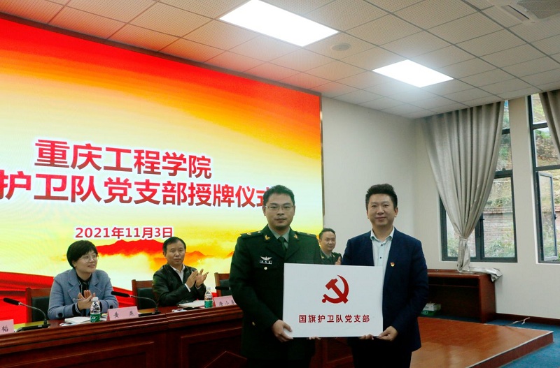 随后校党委委员组织部部长邹均为国旗护卫队党支部授牌。最后全体队员起立面向党旗、国旗宣誓。