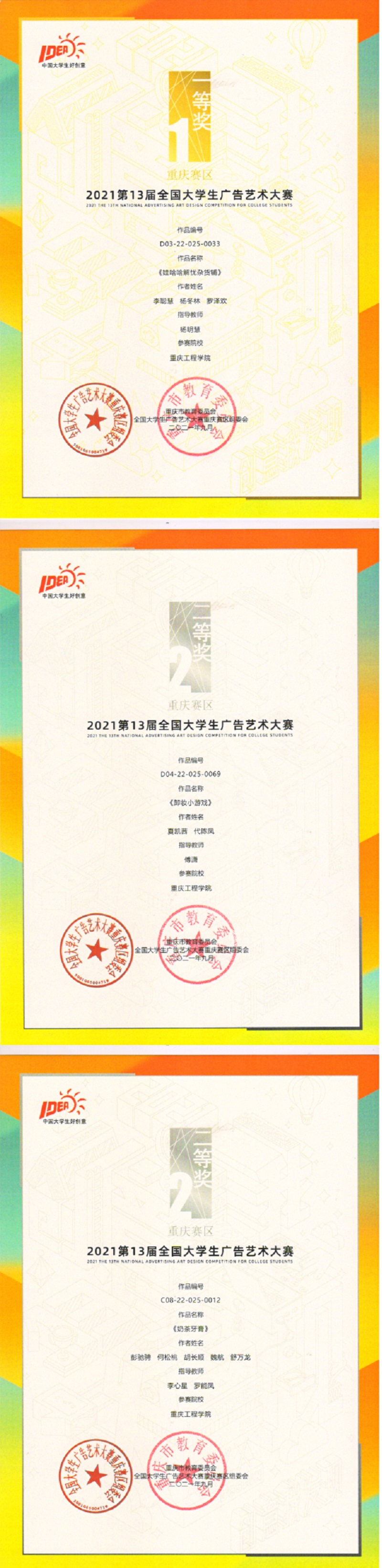 本网讯 (文/图 数字艺术学院 杨明慧)截止2021年11月5日,第13届全国大学生广告艺术大赛(以下简称大广赛)工作圆满顺利结束。我校学子在第13届大广赛中斩获全国二等奖1项、全国优秀奖5项;重庆市一等奖1项、二等奖7项、三等奖16项、优秀奖86项,共计116项,另重庆市优秀指导教师1项。其中数字艺术学院斩获全国二等奖1项、全国优秀奖3项、重庆市一等奖1项、二等奖5项、重庆市三等奖12项、重庆市优秀奖62项,成绩喜人。