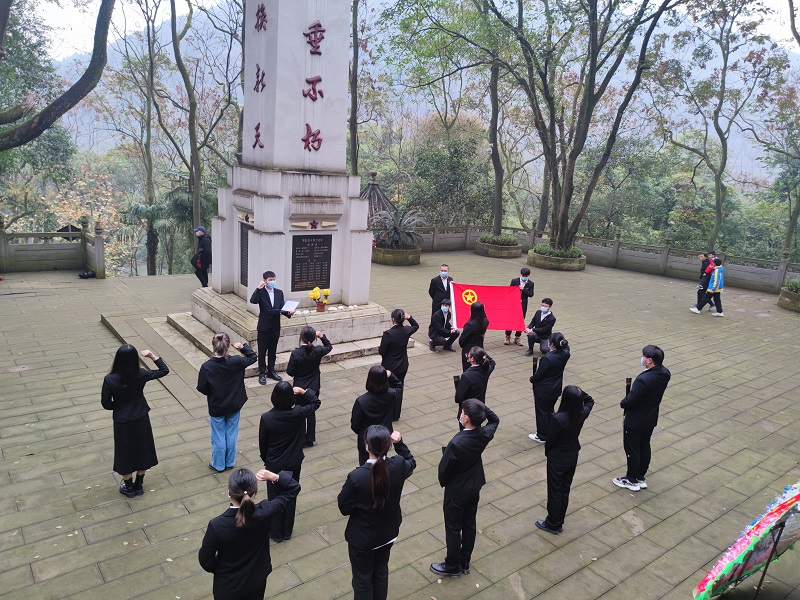 南温泉的每一寸土地上都留下了革命烈士的鲜血,革命烈士的拳拳爱国心至今仍然滚烫,而岁月,让他们的故事更加令人动容。纪念活动伊始,全体团员代表向革命烈士敬献鲜花,寄托哀思的同时也表达了自己对先烈们最诚挚的敬意。随后,校团委社会实践部负责人王渝相豪同学现场讲解了“11·27”背后沉痛悲壮的历史故事并带领全体团员为壮烈牺牲的革命烈士默哀。最后在庄严的团旗下,全体青年团员重温入团誓词并庄严宣誓。