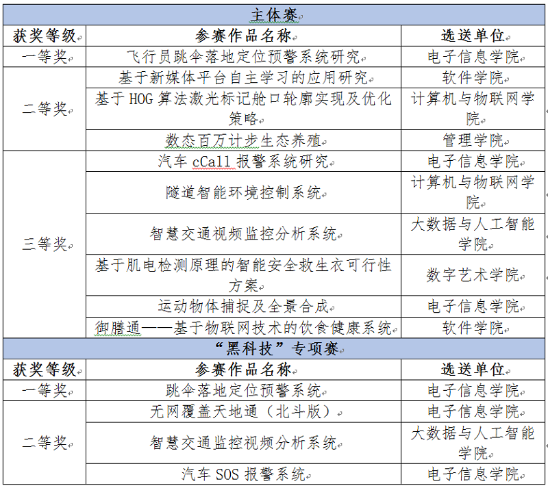 本网讯(文/图 团委 易云丽)日前,由团市委、市教委、市科协、市社科联、市学联共同组织开展的第十七届“挑战杯”全国大学生课外学术科技作品竞赛重庆市选拔赛结果揭晓,我校共斩获14个奖项,其中在课外学术科技作品竞赛(主体赛)市级选拔赛中荣获一等奖1项、二等奖3项,三等奖6项;在“黑科技”专项赛市级选拔赛中荣获一等奖1项、二等奖3项,获奖数创历年新高。其中,“黑科技”专项赛获奖作品数量名列市内参赛高校第三名。获奖作品如下: