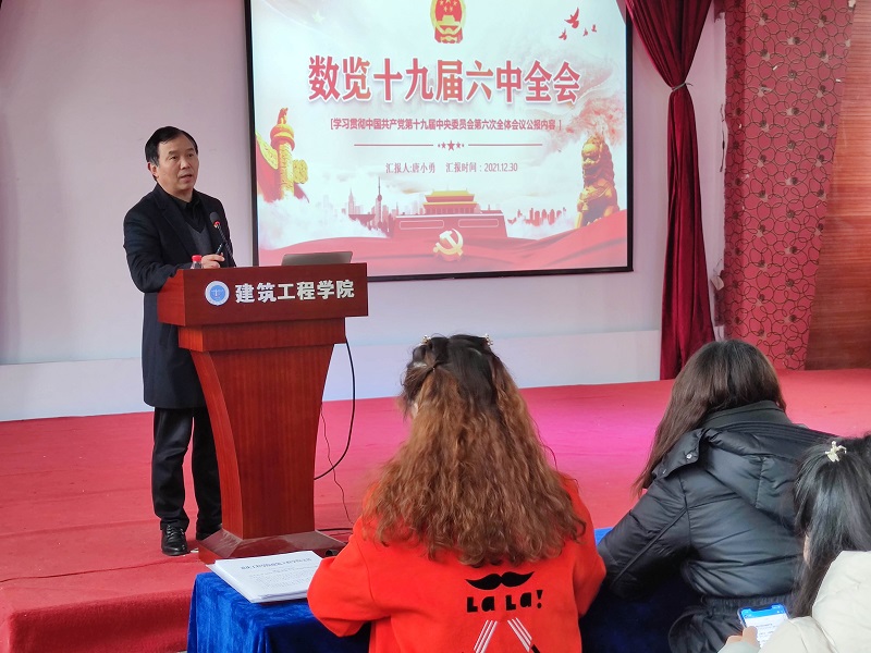 本网讯(文/图 建筑工程学院 吴俊峰),为深入学习贯彻党的十九届六中全会精神, 12月30日,建筑工程学院在三楼多功能厅开展了学习十九届六中全会精神宣讲会,纪委书记兼工会主席唐小勇进行了宣讲,建筑工程学院全体教职工和学生党员参加了会议。