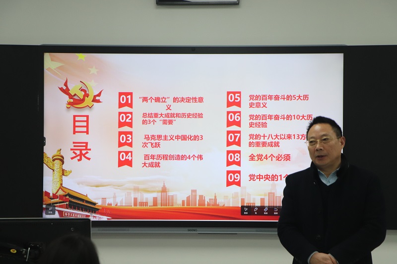 谭明术从“两个确立”的决定性意义、总结重大成就和历史经验的三个“需要”、马克思主义中国化的三次飞跃、百年历程创造的四个伟大成就等方面进行深刻阐述。谭明术强调在场教师需要学习和总结历史,借鉴和运用历史经验,在历史中汲取智慧和力量,同时希望教师们能够巩固拓展党史学习成果,汇聚时代力量,将十九届六中全会精神融入到工作中,为国家培养有爱国情怀、有社会责任感、有创新精神、有实践能力等方面综合素质强的学生而奋斗。