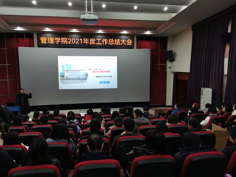 本网讯(文/图 管理学院 宋方伟)1月18日,管理学院在南泉校区阶梯报告厅召开了2021年度工作总结大会,管理学院院长彭建仿,党总支书记刘达斌,副院长李玲,副院长李英吉,以及全体教职工参加了本次总结大会。