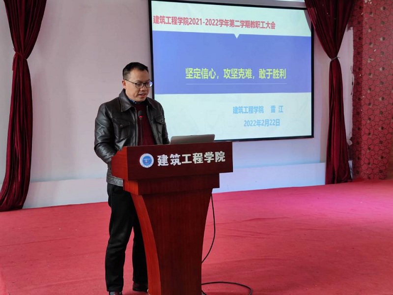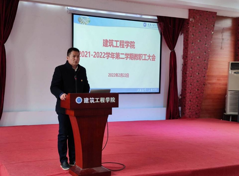 本网讯(文/图 建筑工程学院 吴俊峰) 为推动新学期工作顺利展开,调动全体教职工工作热情,打好合格评估的决胜之战,2月22日下午,建筑工程学院在学院三楼多功能厅隆重召开主题为“我为评估作贡献”的教职工大会,校长助理简玉刚教授应邀出席了大会,会议由学院书记唐和平主持,全体教职工参加。