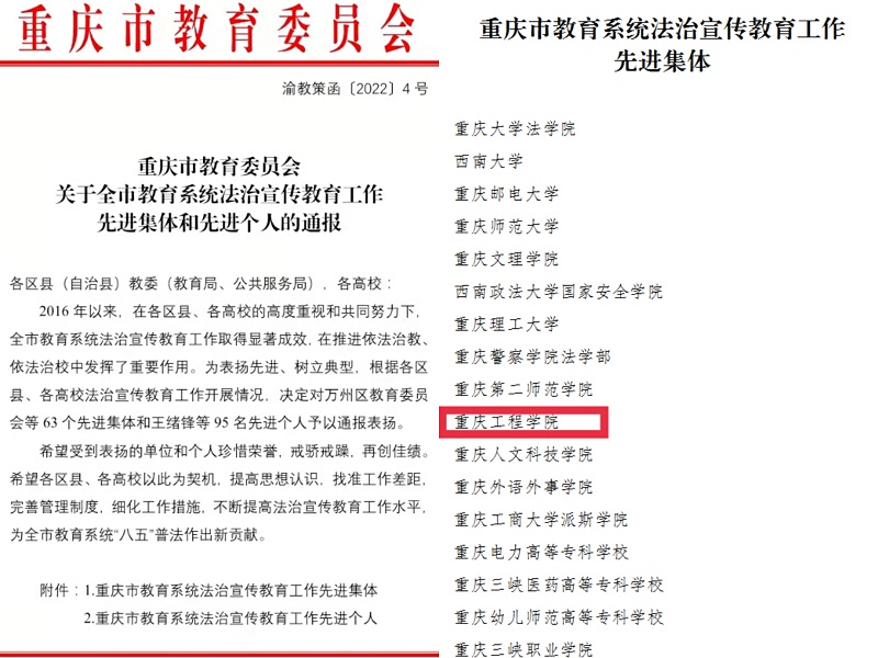 本网讯(文/法制办 黄璐)近日,重庆市教育委员会发布《关于全市教育系统法治宣传教育工作先进集体和先进个人的通报》(渝教策函〔2022〕4号),我校因成绩突出被评为“重庆市教育系统法治宣传教育工作先进集体” 荣誉称号。同时,学校法制办主任邹均同志获得“重庆市教育系统法治宣传教育工作先进个人”荣誉称号。