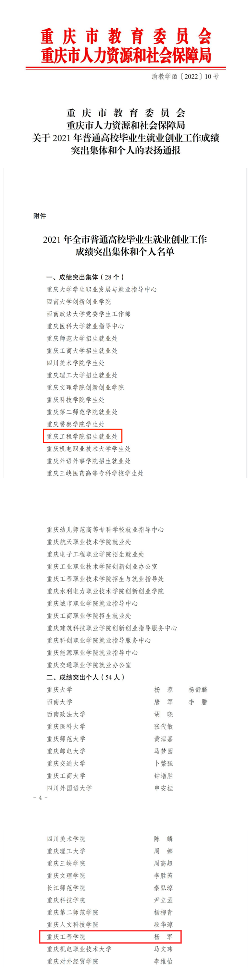 本网讯(文/图 招就处 叶秋清)近日,重庆市教委和市人社印发《重庆市教育委员会、重庆市人力资源和社会保障局关于2021年普通高校毕业生就业创业工作成绩突出集体和个人的表扬通报》(渝教学函〔2022〕10号),我校招生就业处被评为重庆市2021年高校就业创业工作业绩突出集体,杨军同志被评为成绩突出个人。
