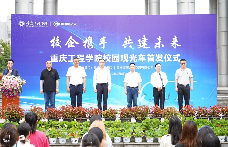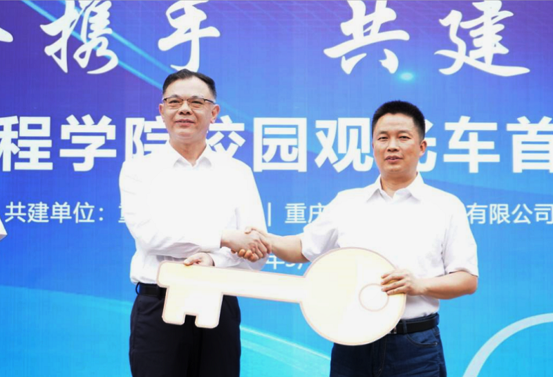 仪式上,桂国庆与陈正交换象征着开启合作成功大门的金钥匙。黄立在致辞中表示校园观光车项目的成功运行提升了校区交通服务多元化及便利性,输出公交新模式与运营经验,提升校园服务水平。今后双方将进一步扩大多业态的校企合作,积极探索产学研结合的新路子。最后,黄立宣布重庆工程学院校园观光车首列发车。