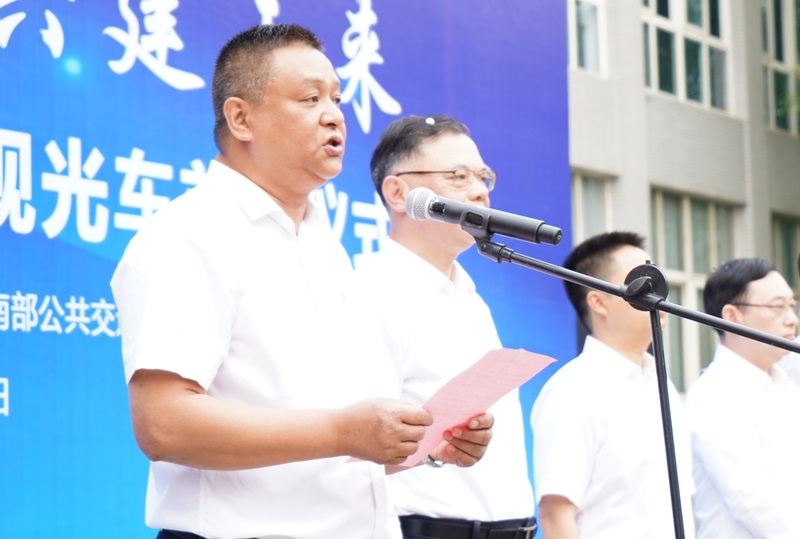 张业平在致辞中首先代表学校对一直以来关心和支持我校发展的重庆公交集团和重庆南部公共交通有限公司表示感谢。他表示,“校园观光车”项目是学校经过认真调研、精心组织、用心筹备的服务广大师生的又一项民生工程,是为师生办实事的具体举措。重庆南部公共交通有限公司作为一家有着80多年历史的大型国有城市骨干客运交通企业,相信他们定能为我校师生提供优质、安全的服务。学校将一如既往坚持以学生发展为中心,为师生员工细致服务,也期待着校园观光车服务践行好“服务无止境、真诚有言行”的理念,让校园观光车成为学校一道“亮丽风景线”。