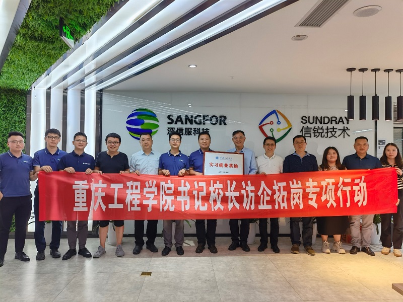 本网讯(文/图 计算机与物联网学院 魏克非)为贯彻落实教育部、重庆市教委关于高校书记校长访企拓岗专项行动工作的要求,加强校企合作、拓展就业岗位,助力我校毕业生更加充分、更高质量就业, 5月9日上午,在校长桂国庆的带领下,招就处副处长吴优,计算机与物联网学院书记覃华伟、副院长李波、网络工程主任张杰、就业科科长魏克非一行6人赴深信服科技股份有限公司重庆办事处开展了访企拓岗暨授牌活动。
