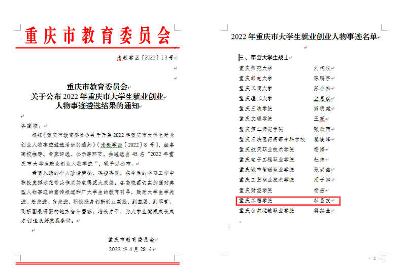 据悉,本次事迹遴选活动是重庆市教委为贯彻落实《教育部关于做好2022届全国普通高校毕业生就业创业工作的通知》(教学〔2021〕5号)和《重庆市教育委员会关于做好2022届全市普通高校毕业生就业创业工作的通知》(渝教学发〔2021〕22号)要求,引导支持毕业生参军入伍和到基层就业创业,深入宣传国家和地方促进就业创业相关政策,挖掘就业创业先进典型,发挥示范带动作用,营造全社会支持毕业生就业的良好舆论氛围的重要活动。经各高校推荐、专家评选、公示等环节,全市共遴选出45名大学生就业创业人物事迹。我校学生邬昌友入选“军营大学生战士”。