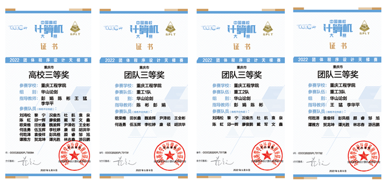 本网讯(文/图 软件学院 陈彬)5月12日,我校软件学院3支队伍荣获2022年团体程序设计天梯赛“华山论剑”组团队三等奖3项,摘得重庆市高校三等奖。
