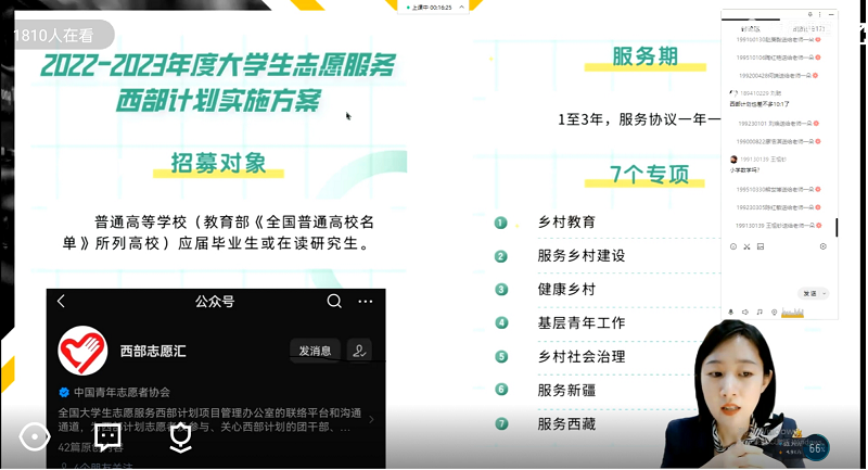本网讯(文/图 校团委 金质纯)为进一步增强我校青年学生的志愿服务意识,帮助同学们更好掌握“西部计划”面试技巧,5月19日晚,我校西部计划项目办、大学生素质教育中心社会实践教研室联合举办“西部计划面试求职技巧”线上专题培训,主讲嘉宾为国家高级礼仪培训师刘晏岑女士,共有2500余人参与此次线上专题培训。