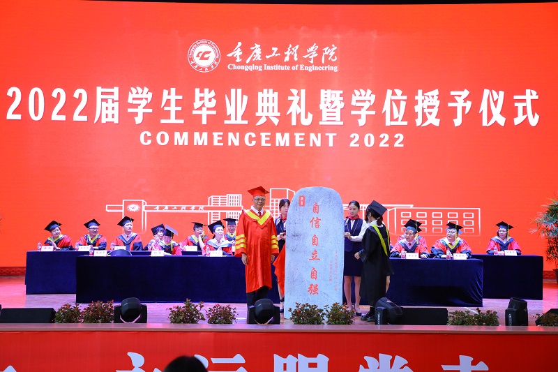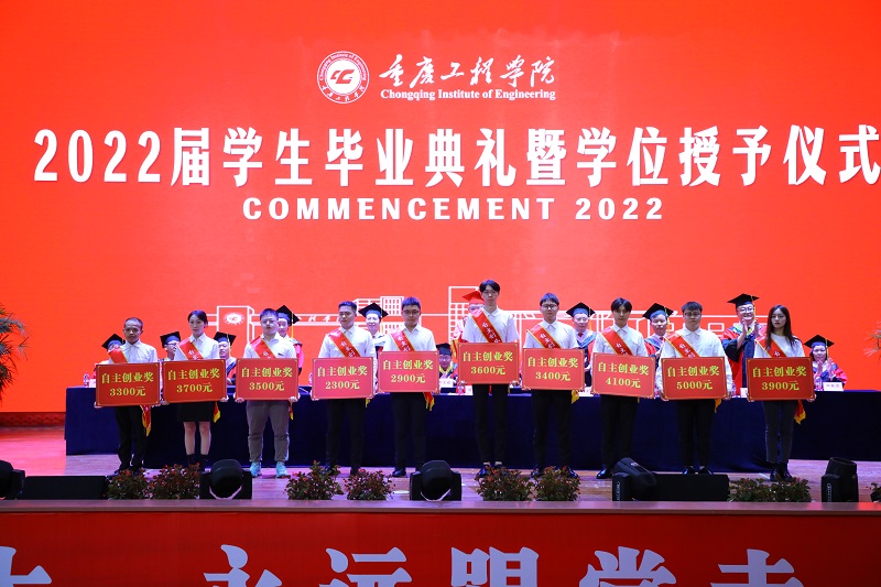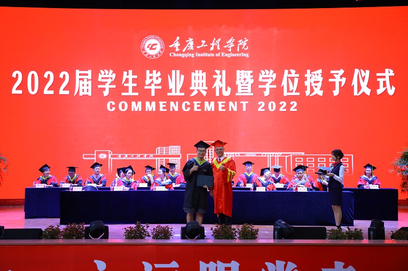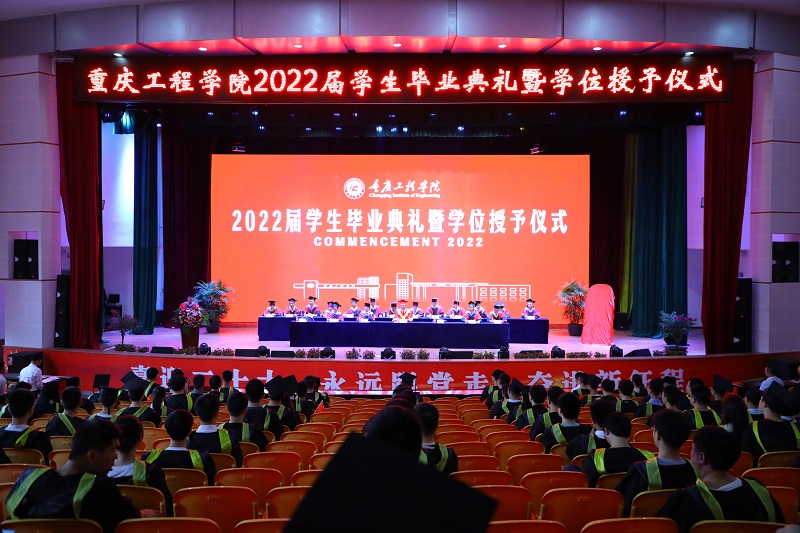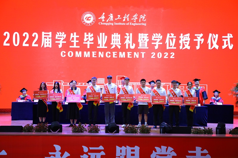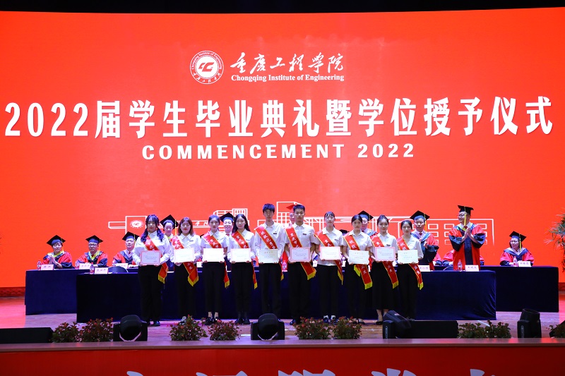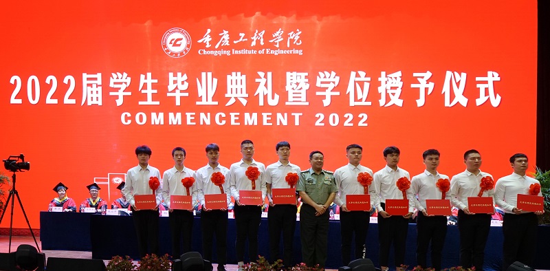 副校长王建东宣读了《重庆工程学院关于表彰2022年优秀毕业生的决定》,并向获表彰学生及全体毕业生致以热烈祝贺。校领导为2022届本科生代表颁发毕业证书,为优秀毕业生代表、自主创业优秀毕业生代表、考研录取毕业生代表颁奖。巴南区委常委、区人民武装部政委王恩平大校为今年应征入伍的毕业生代表颁发了预定兵通知书。