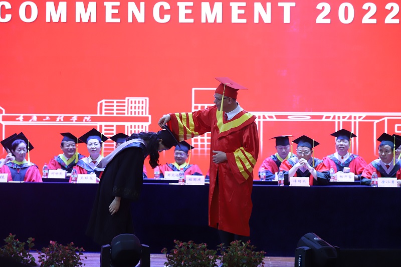 校长桂国庆为2022届本科生代表授位——正冠拨穗、颁发证书、合影留念。毕业生代表周星宏、教师代表汪俊良分别发言。之后,毕业生代表向母校赠送了礼物。