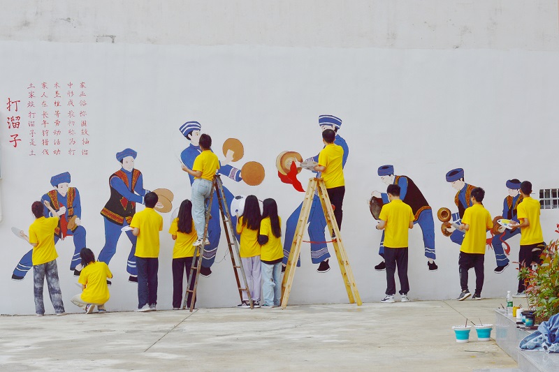 数字艺术学院实践团在渝北区统景镇田牧村成功开展“墙绘新时代,建设新农村”主题实践活动。志愿队员首先在当地干部带领下详细参观了解了田牧村房屋风格、村庄布局、人文风俗和整体风貌。实践活动过程中,青年志愿者们热情高涨,战高温、斗酷暑,加班加点,精心设计,对田牧村外墙进行了绘画装饰,将中华优秀传统文化、社会主义核心价值观、十九届六中全会精神等内容以漫画、标语的形式绘到墙面,向村民倡导文明健康和积极向上的价值观念。