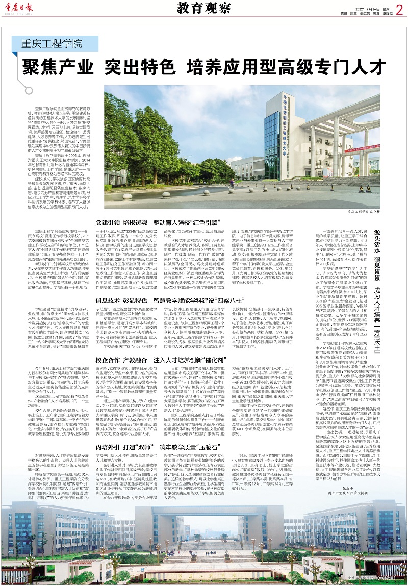 本网讯(文/党委宣传部)今天,2022年9月26日《重庆日报》整版刊发我校党委副书记、常务副校长张业平署名文章《聚焦产业 突出特色 培养应用型高级专门人才》,报道我校办学成果。