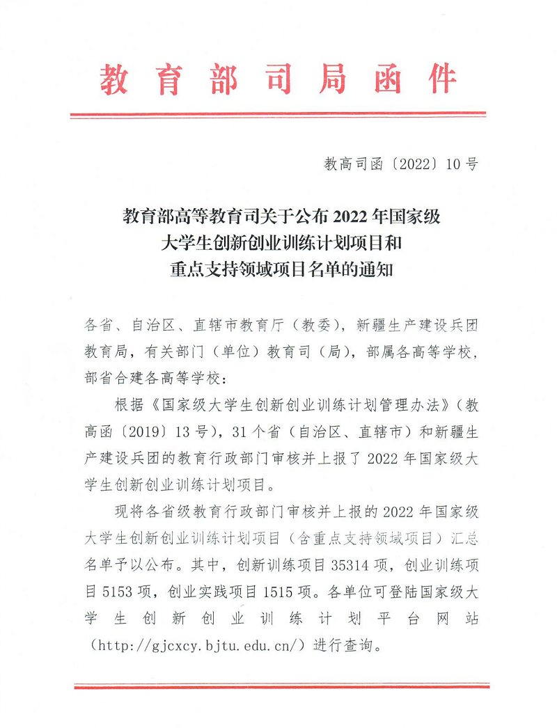 本网讯(文/图 创新创业学院 王乙棋)近日,教育部高等教育司公布了2022年国家级大学生创新创业训练计划项目名单,我校10个项目获得立项,是我校自2015年以来获国家级大学生创新创业训练计划立项项目数量最多的一次。